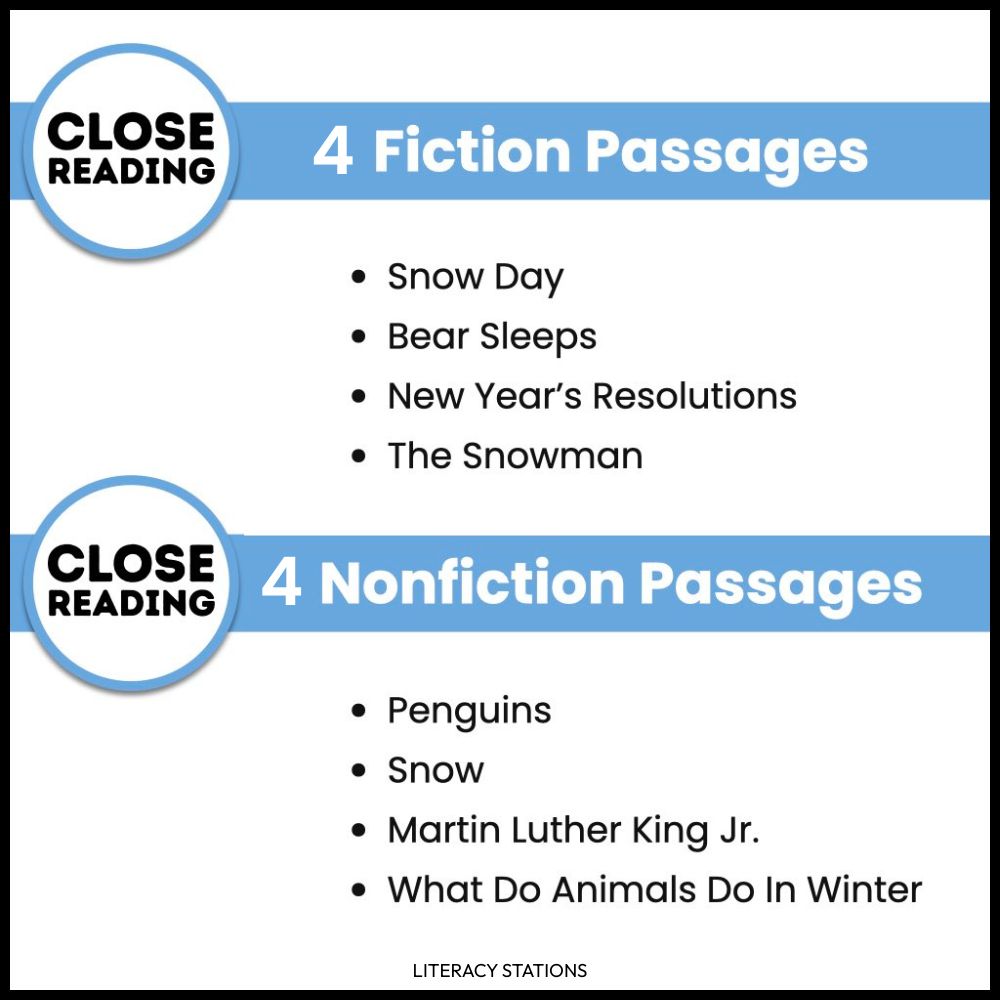 Close reading strategies help first grade students build vocabulary, improve comprehension, and increase fluency. This set of January close reading passages includes eight texts (four fiction and four nonfiction), each supported by a five-day lesson plan for teaching close reading in first grade.